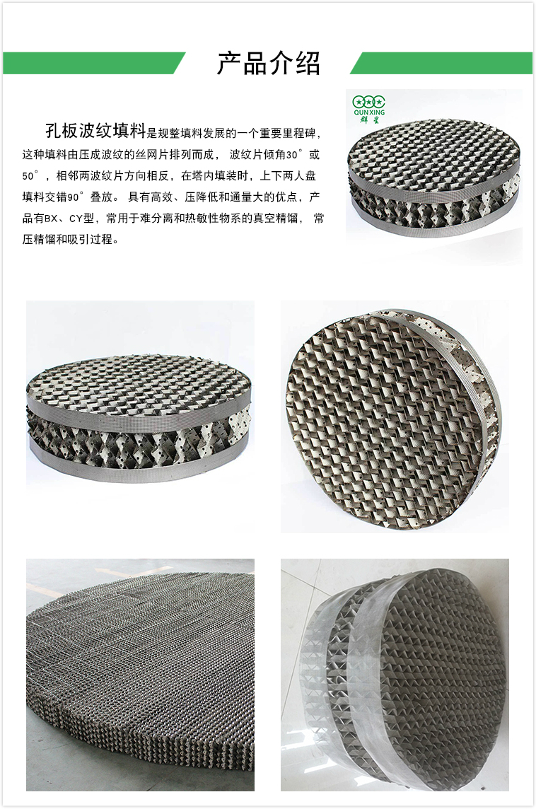 重點介紹金屬絲網(wǎng)波紋包裝,它是波紋包裝的主要方式,主要由金屬絲網(wǎng)制成,較常用的有不銹鋼、碳鋼、鋁、銅等,當然也可根據(jù)客戶需要選擇其他材料。雖然波紋金屬絲網(wǎng)填料的成本相對較高,但由于其分離能力強、比表面積大、空位率高、阻力小等優(yōu)點而得到廣泛應用,特別是用于精細蒸餾和真空蒸餾設備,以及熱敏性材料的蒸餾。